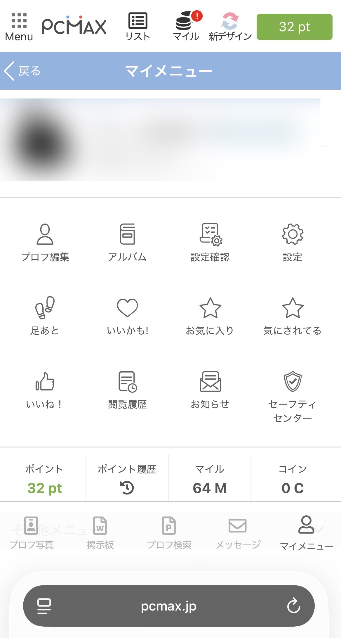 PCMAXはワクワクメールやハッピーメールと違って表示されている項目が少ないですが、左上のメニューボタンから全ての機能にアクセスすることができるようになっています。